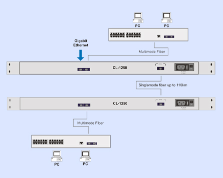 The CL-1250C is a Gigabit Ethernet transceiver that repeats optical signals between two fiberoptic ports. The CL-1250C can convert signals between RJ-45 Gigabit Ethernet connections and singlemode fiber optic. CL-1250C can be configured to transmit over one or two fiber strands. The CL-1250C expands network data transmission distances beyond 100m limitation of twisted pairto maximum 110km by transmitting over singlemode fiberoptic cable in ful duplex mode. The CL-1250C has easy-to-read diagnostic LED's for continuous status report on network speed, duplex media access control connection and network traffic. The CL-1250C uses standard SC or SC/APC fiberoptic connectors and is IEEE 802.3z 1000BASE-FX compliant and operates with all devices that adhere to this standard.