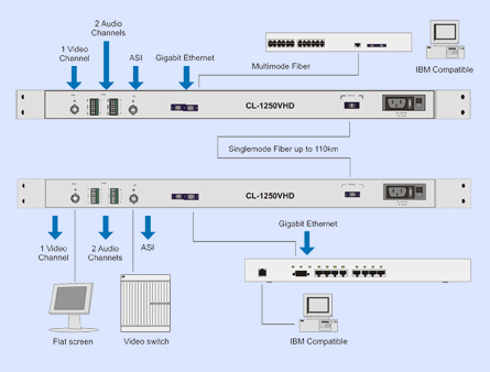 The CL-1250VHD multiplexes a Gigabit Ethernet (GIG-E) transceiver with a Video/Audio Multiplexer. The Video/Audio multiplexer may be configured for one baseband video and 2-8 channels of audio and one high speed data channel, such as SDI or DVB-ASI or HD-SDI. The CL-1250VHD can be configured to transmit over one or two fibre strands. It has easy-to-read diagnostic LED's for continuous status reports on network speed, duplex media access control connection, and network traffic. The CL-1250VHD uses standard SC or SC/APC fibre optic connectors and is IEEE 802.3z 1000BASE-FX compliant and operates with all devices that adhere to this standard.