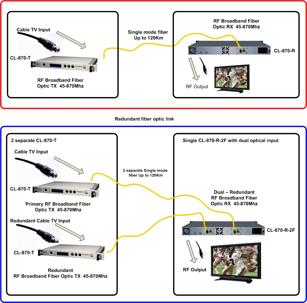 The CL-870-R-2F is used for receiving RF cable TV signals (45-870MHz) that are transmitted over an optical fibre. The unit can receive optical signals in either the 1310nm or the 1550nm bands. Designed to work well with the CL-870-T units, the CL-870-R-2F has two optical receivers as well as two power supplies. When one power supply becomes too warm the unit will automatically switch to the second power supply. The second optical receiver adds further redundancy and system reliability. The CL-870-R-2F features an easy to read front panel LCD screen that displays relative operating status and fault information. All operating parameters of the CL-870-R-2F series receivers are designed for high reliability and suitable fore even the most high end applications.