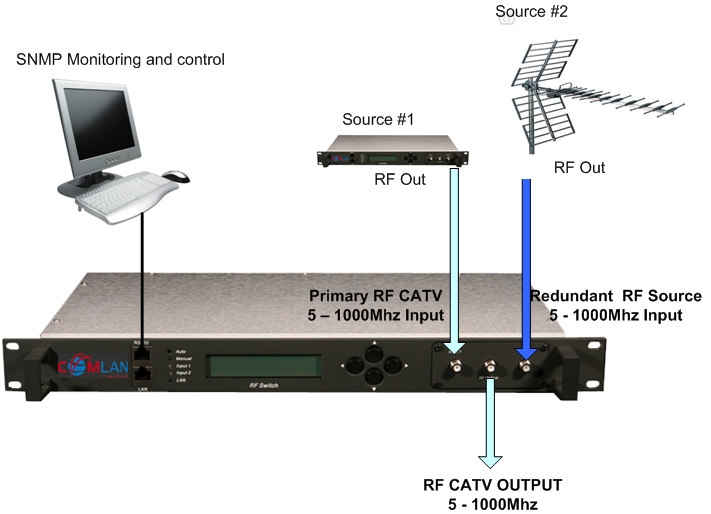 An RF switch is used for signal distribution redundancy or for remote RF switching. Our RF Switch has two inputs and a single output. One of the inputs acts as the primary channel while the second is used for fallover protection. When the switch detects that the incoming RF to the primary channel has dropped below a set reference level the unit will immediately switch to the backup channel. The unit can also be switched manually by either its front control panel or remotely via SNMP or RS-232. Our unit features full remote management for setting system parameters an system monitoring.