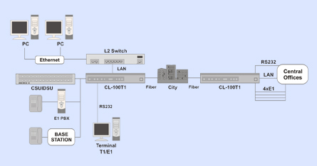 CL-100T1, a Fiberoptic Multiplexer with Ethernet + 4xE1/T1 + RS232 interfaces, provides multiple broadband transmission capacities over one fiberoptic strand for point-to-point connectivity. With short/long haul optical transceivers, CL-100T1 may provides short/long reach up to 11 Okm distance. The Ethernet interface is 100 Mbps auto negotiation and can be full/half duplex. The E1 is transparent and in full rate, which can support the E1 framed and unframed mode, including fractional E1. The RS232 interface is set at the rate of 115.2 Kbps, none parity, 8 data bit, 1 stop bit. A pair of CL-100T1 offers a cost effective solution for Fiber to the Building (FTTB) applications to meet various corporate/enterprise demands such as MTU/MDU. The CL-100T1 is indeed an ideal FTTB broadband solution for LAN-to-LAN connectivity, InternetAccess, Serial RS232and multiple E1 Broadband Voice/data/video applications.