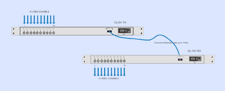 The CL-10V is ideal for transmitting up to 10 channels of video on fibre optic cable. The CL-10V operates by digitizing and multiplexing 10 channels of standard analogue video into a high-speed serial cable. Because the system employs true digital transmission techniques, performance characteristics are consistent and maintained over the specified distance with absolutely no degradation of signal; there are no FM carriers that need to be tuned or that can drift over time. The low component count and use of customized ASICs increase system reliability and performance. The CL-10V is designed to work with standard single mode or multimode fibre optic cables and can be wall mounted or rack mounted. Both transmitter and receiver come equipped with internal power supplies. Using selectable cable equalization, it controls the transmitter unit allowing for long lengths of coax cable for widely spaced video sources. To be accommodated without any sacrifice in picture sharpness or quality. Built-in diagnostics LEDs for each channel; loss of signal/broken fibre alarm and colour bar generator facilitate rapid setup and the continuous monitoring of all phases of operation.